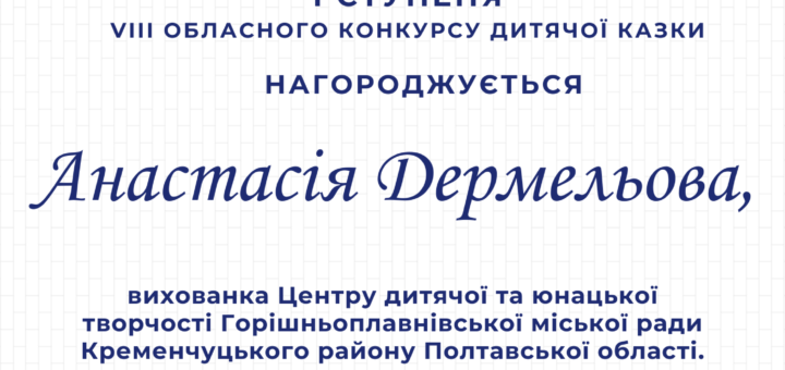 Щиро вітаємо з перемогою у обласному конкурсі дитячої казки Дермельову Анастасію, вихованку студіії біологічного малюнка “Левенгук” (керівник Валерій Вікторович Калашник). Наша вихованка посіла І місце...